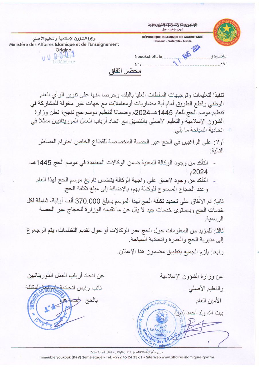 أعلنت وزارة الشؤون الإسلامية والتعليم الأصلي عن توقيع اتفاق مع اتحادية السياحة التابعة لاتحاد أرباب العمل الموريتانيين يحدد تكلفة الحج عبر الوكالات في 3.7 مليون أوقية قديمة.