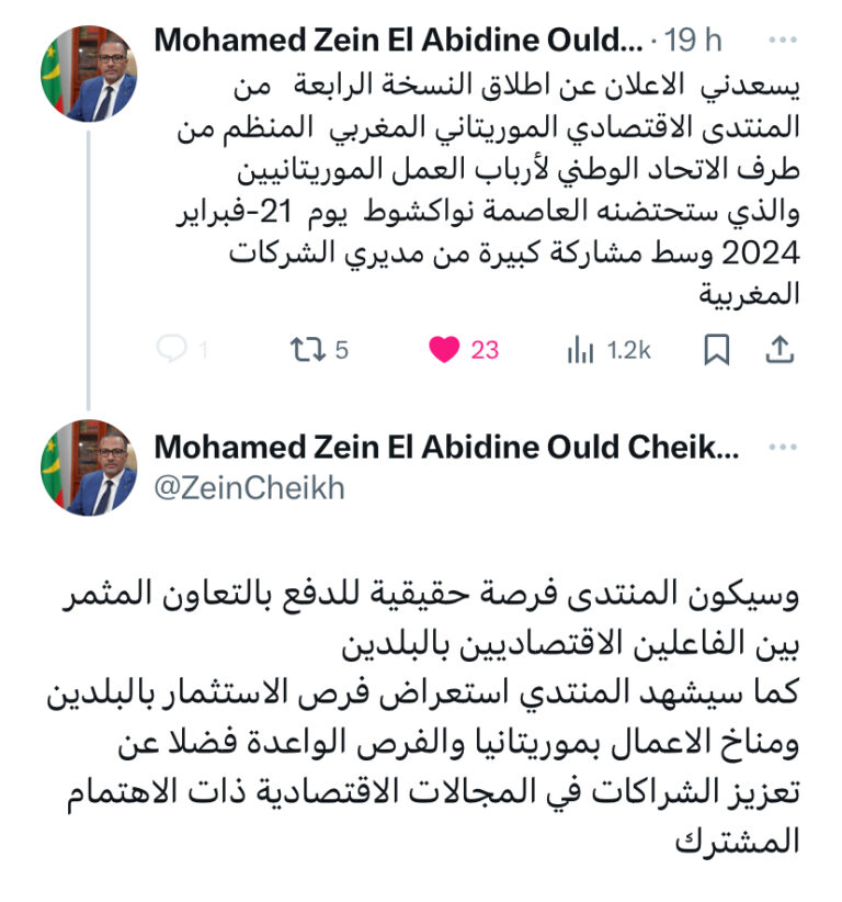 جاذ لك في تغريدة لرئيس الاتحاد الوطني لأرباب العمل الموريتانيين على منصة X