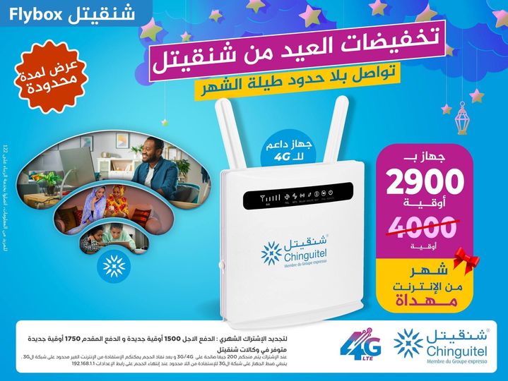 تخفيض بمناسبة عيد الفطر المبارك،🤩 سارع للحصول على جهاز FLYBOX الداعم للـ4G و الـ3G فقط بـ2900 أوقية بدلا من 4000 أوقية و استفد من شهر من الإنترنت مجانا🤩
