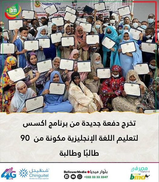 ترأست صباح اليوم الأحد السفيرة الأمريكية كيرشت والأمين العام لوزارة التهذيب الوطني على حفل تخرج دفعة جديدة من برنامج اكسس لتعليم اللغة الإنجليزية مكونة من 90 طالبًا وطالبة من مدارس و ثانويات مختلفة من جميع أنحاء موريتانيا .