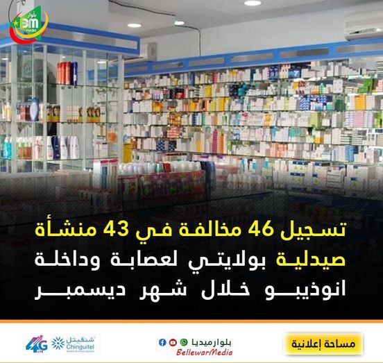 تسجيل 46 مخالفة في 43 منشأة صيدلية بولايتي لعصابة وداخلة انوذيبو خلال شهر ديسمبر