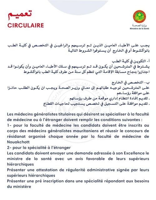 يجب على الأطباء العامين الذين تم ترسيمهم والراغببن في التخصص في كلية الطب بانواكشوط أو في الخارج أن يستوفوا الشروط التالية: