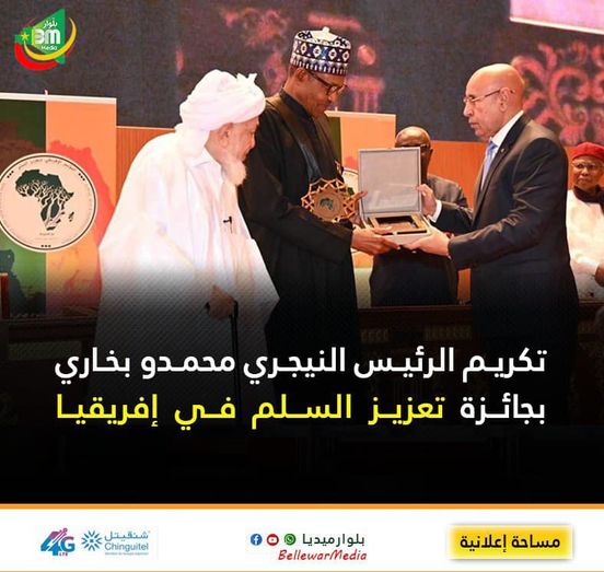 وسلم الجائزة للرئيس النيجري نظيره الموريتاني، محمد ولد الشيخ الغزواني، على هامش حفل افتتاح النسخة الثالثة من المؤتمر الإفريقي للسلم 2023، التي انطلقت اليوم تحت شعار: “ادخلوا في السلم كافة”.
