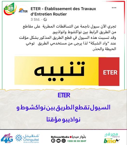 تنويه من مؤسسة أشغال صيانة و إصلاح الطرق ETER تجري الآن سيول ناجمة عن التساق…