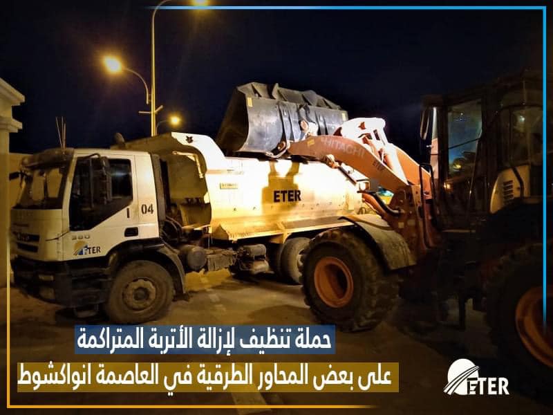 تواصل فرق فنية تابعة لمؤسسة أشغال صيانة الطرق عملها ضمن حملة تنظيف و إزالة الأتربة المتراكمة التي تتجمع على بعض الشوارع والمحاور الطرقية في العاصمة انواكشوط.