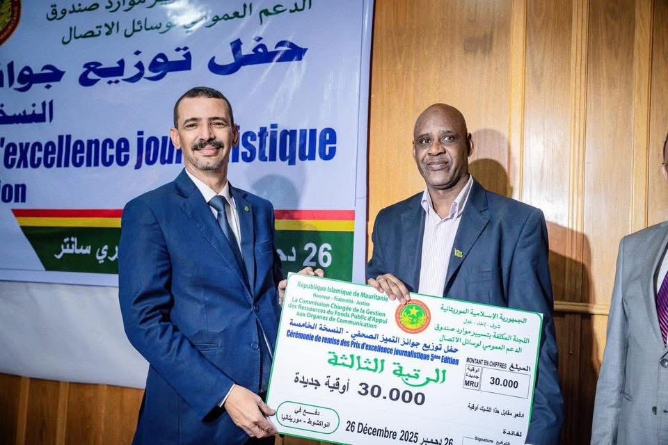 احتضنت العاصمة نواكشوط، أمس الجمعة، حفل توزيع جوائز النسخة الخامسة من مسابقة التميز الصحفي، المنظمة من طرف اللجنة المكلفة بتسيير وتوزيع صندوق الدعم العمومي لوسائل الاتصال.