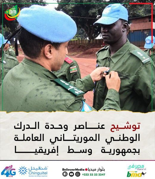 وشحت منظمة الأمم المتحدة، يوم أمس، بمدينة ابريا بوسط إفريقيا، عناصر وحدة الدرك الوطني الموريتاني، الحادية عشرة، العاملة ضمن قوات حفظ السلام بجمهورية وسط إفريقيا.