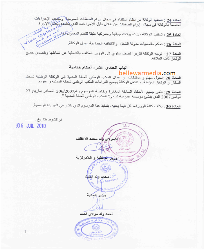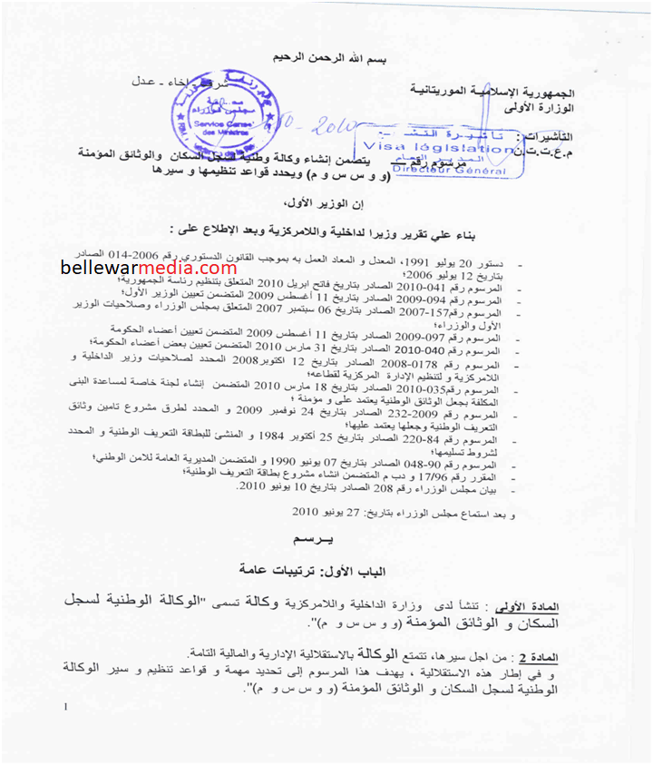 أن الوكالة الوطنية لسجل السكان و الوثائق المؤمنة قد أنشئت بموجب المرسوم 0150/2010 /و.أ/و.د.ل، الصادر بتاريخ:06 يوليو 2010م (مرفق 1) ؛