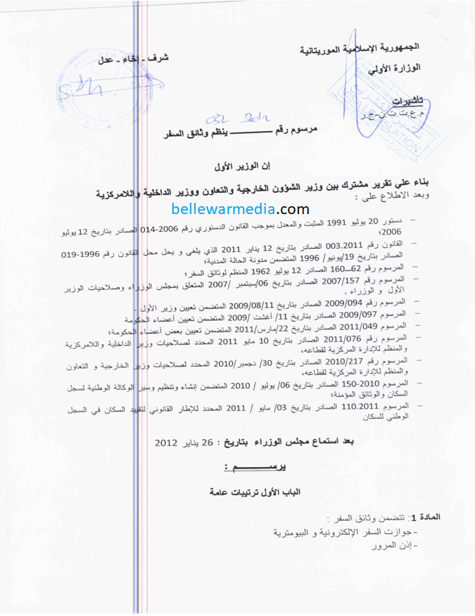 أن صدور أول جواز سفر بيومتري كان بتاريخ:09 فبراير 2012 تطبيقا للمرسوم الصادر عن الوزير الأول، رقم:032/2012 بتاريخ:26 يناير 2012 المنظم لوثائق السفر (مرفق2)،