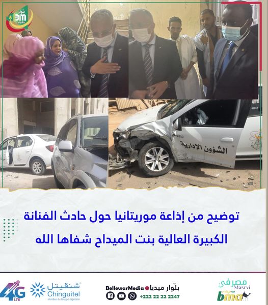 بعد استماعنا لتصريح إحدى أخوات الفنانة العالية بنت الميداح مع إحدى منصات التواصل الاجتماعي حول تداعيات حادث السير، الذي اصطدمت خلاله سيارة الفنانة مع سيارة المدير الإداري للإذاعة، والتي كان يقودها السائق المصاب في الرأس والكتف أحمد ولد آباه.. وعطفا على ما ورد في التصريح يؤكد المدير الإداري لإذاعة موريتانيا المعطيات التالية: