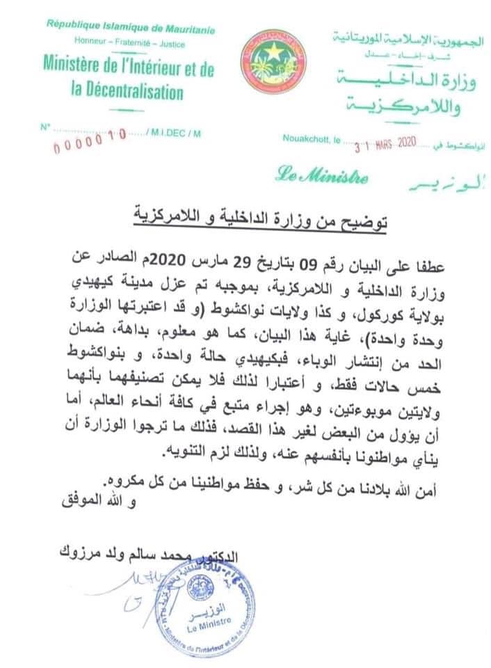 عام توضيح من وزارة الداخلية حول وصف نواكشوط وكهيدي موبوءتين .. 31 مارس، 2020 31 مارس، 2020 شاركها فيسبوك X واتساب مشاركة عبر البريد