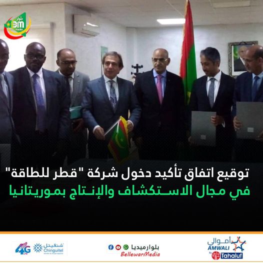 العملاقة وشركة “قطر للطاقة” والشركة الموريتانية للمحروقاتوبموجب الاتفاق المذكور يتم تأكيد دخول شركة “قطر للطاقة” في مجال الاستكشاف والانتاج بموريتانيا وذلك على مستوى الحوض الساحلي الموريتاني وتحديدا المقطع البحري C10 الذي تمتلك قطر للطاقة نسبة 40% من عقد الاستكشاف والانتاج الخاص به.