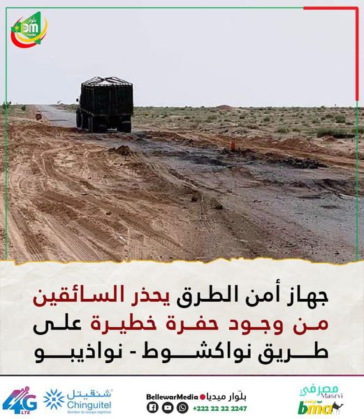 حذر جهاز أمن الطرق كافة السائقين على طريق نواكشوط- نواذيبو من وجود حفرة خطيرة عند الكلمتر 160 من نواكشوط.
