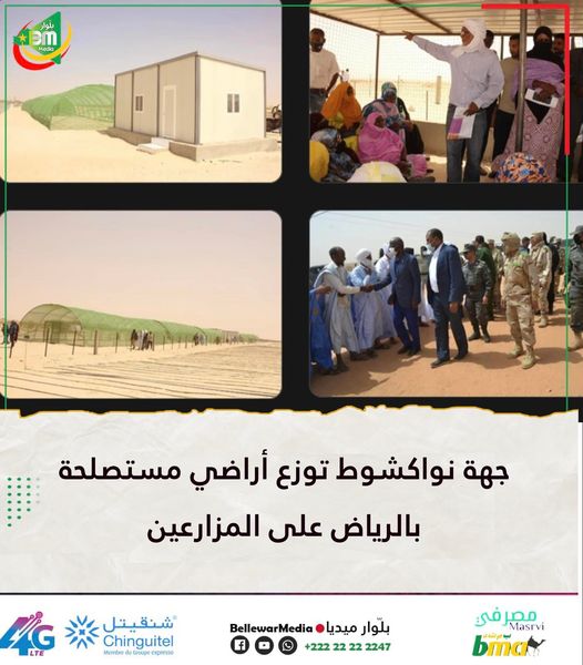 بعد اكتمال الإجراءات التحضيرية لانطلاق مشروع الزراعة الحضرية، قامت جهة نواكشوط صباح اليوم 14 مارس 2022 بتوزيع القطع الأرضية المستصلحة بالكيلومتر 17 على طريق روصو على المزارعين المستفيدين من هذا المشروع، الذي تسعى الجهة من خلاله إلى الحد من البطالة ودمج الشباب في سوق العمل، إضافة إلى المساهمة في تحقيق الإكتفاء الذاتي من الخضروات والفواكه.