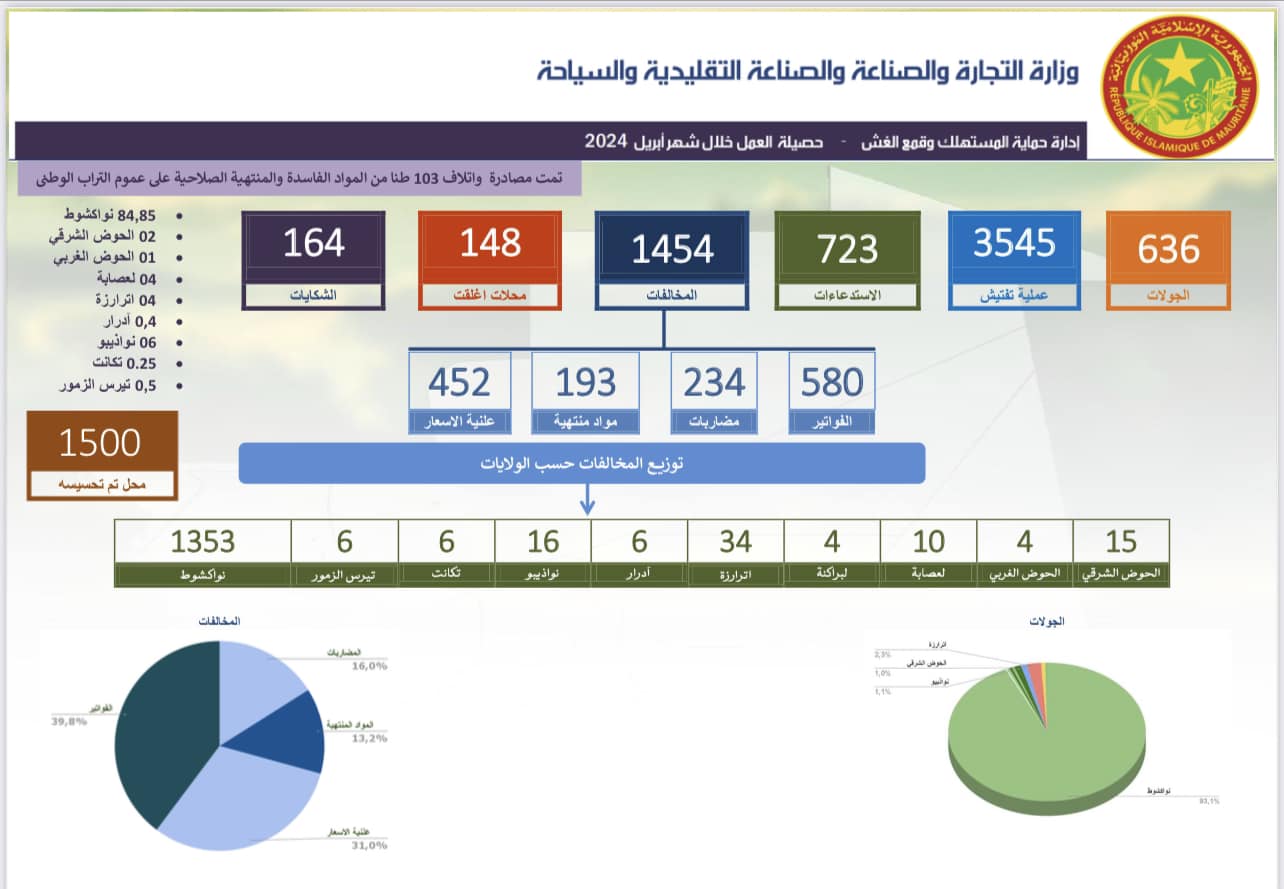 .إغلاق 148 محلا تجاريا نتيجة لمخالفات تتعلق بالمضاربات وعدم علانية الأسعار ووجود مواد منتهية الصلاحية في ولايات انواكشوط الثلاثة وفتحت كلها بعد تسديد الغرامات المترتبة عليها طبقا للقانون .
