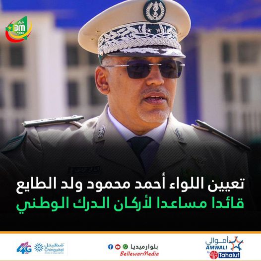 رئاسة الجمهورية تعلن أنه، بموجب مرسوم صادر اليوم الأربعاء، تم تعيين اللواء أحمد محمود ولد الطايع، قائدا مساعدا لأركان الدرك الوطني.