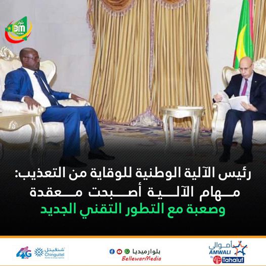 قال رئيس الآلية الوطنية للوقاية من التعذيب، البكاي ولد عبد المالك عقب لقائه مع رئيس الجمهورية محمد ولد الشيخ