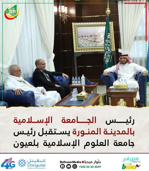 استقبل رئيس الجامعة الإسلامية بالمدينة المنورة ، الأمير أ.د.ممدوح بن سعود آل سعود، ظهر الأربعاء بمكتبه رئيس جامعة العلوم الإسلامية بلعيون، لبروفيسور محمدو ولد لمرابط اجيد.
