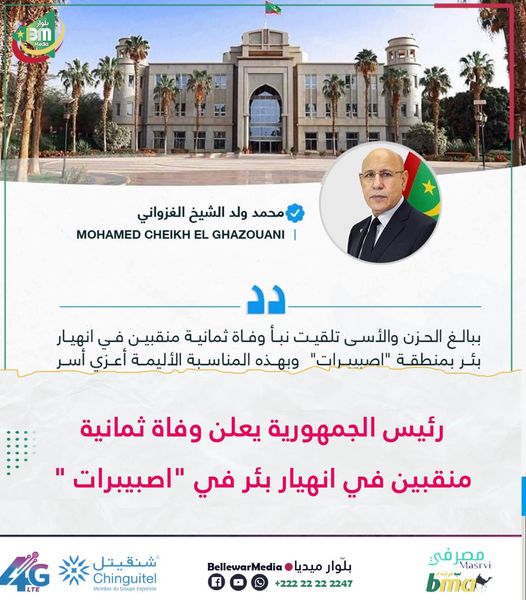 ببالغ الحزن والأسى تلقيت نبأ وفاة ثمانية منقبين في انهيار بئر بمنطقة “اصبيبرات” وبهذه المناسبة الأليمة أعزي أسر الضحايا، وأسأل الله الرحمة للذين قضوا ولذويهم الصبر والسلوان، وأدعو مواطنينا العاملين في المجال إلى اتخاذ أقصى درجات الحيطة والحذر، واحترام تدابير الأمن والسلامة.