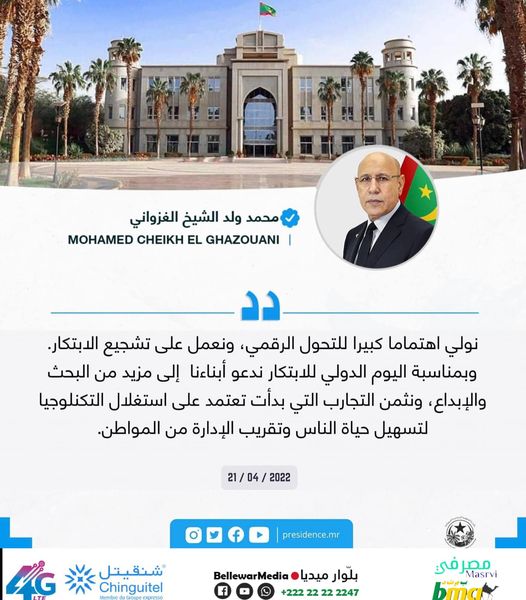 نولي اهتماما كبيرا للتحول الرقمي، ونعمل على تشجيع الابتكار. وبمناسبة اليوم الدولي للابتكار ندعو أبناءنا إلى مزيد من البحث والإبداع، ونثمن التجارب التي بدأت تعتمد على استغلال التكنلوجيا لتسهيل حياة الناس وتقريب الإدارة من المواطن.