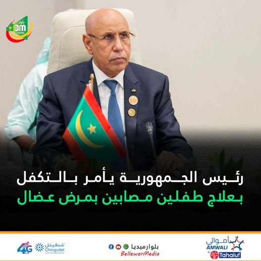 أمر رئيس الجمهورية محمد ولد الشيخ الغزواني بالتكفل بعلاج طفلين مصابين بمرض عضال في حي لغريكة في دار النعيم بالعاصمة نواكشوط.