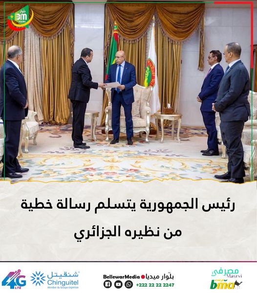 تسلم رئيس الجمهورية، محمد ولد الشيخ الغزواني، صباح اليوم الإثنين، رسالة خطية من صاحب الفخامة السيد عبد المجيد تبون،الرئيس الجزائري.