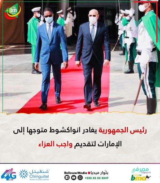 غادر رئيس الجمهورية محمد ولد الشيخ الغزواني، العاصمة انواكشوط زوال اليوم السبت متوجها إلى دولة الإمارات العربية المتحدة.