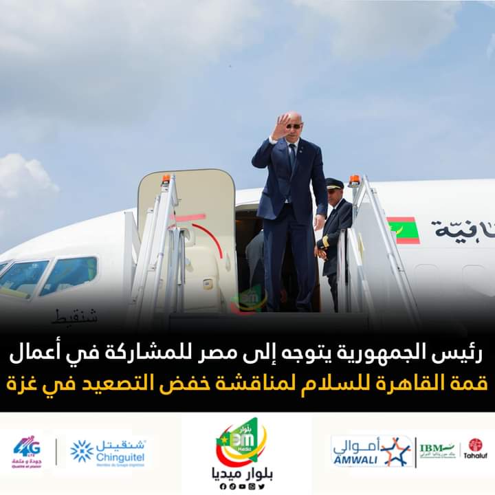 توجه رئيس الجمهورية محمد ولد الشيخ الغزواني، صباح اليوم الجمعة، إلى العاصمة المصرية القاهرة، للمشاركة في أعمال قمة “القاهرة للسلام ” التي تسعى لمناقشة خفض التصعيد فى قطاع غـ•زة والأراضي الفلسـ•طينية المحـ•تلة.