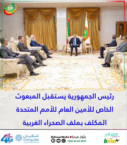 استقبل رئيس الجمهورية، السيد محمد ولد الشيخ الغزواني، اليوم الاثنين بالقصر الرئاسي في نواكشوط، المبعوث الخاص للأمين العام للأمم المتحدة المكلف بملف الصحراء الغربية، السيد استفان دي مستورا.
