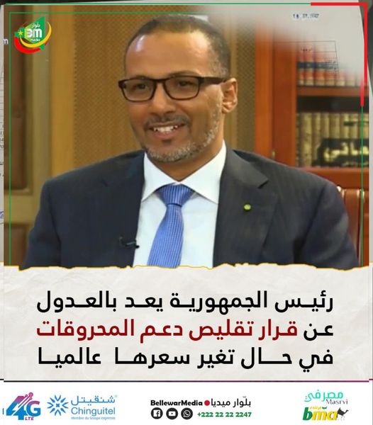 وأكد ولد الشيخ أحمد في تغريدة على حسابه بتويتر، أن رئيس الجمهورية، استعرض لهم خلال اللقاء “بتفصيل، انعكاسات ارتفاع الأسعار عالميا على المستوى المحلي، والتي دعت الحكومة لتخفيض دعم المحروقات بنسبة ثلاثين بالمائة”.