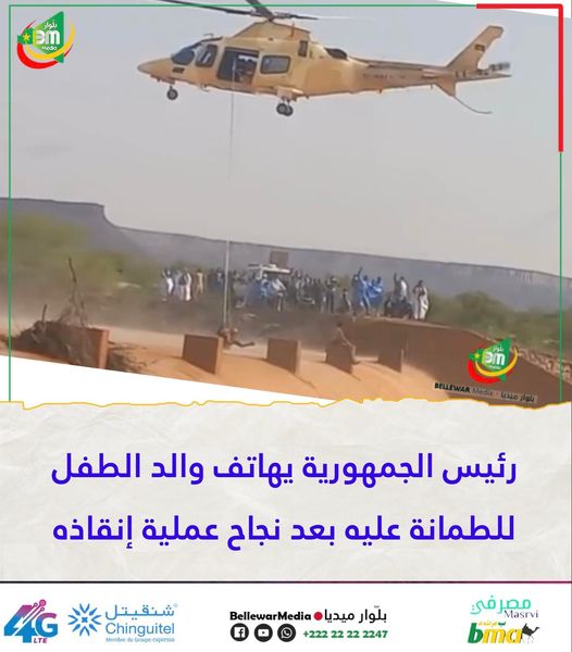 أجرى رئيس الجمهورية السيد محمد ولد الشيخ الغزواني اتصالا هاتفيا بوالد الطفل محمد أحمد، الذي كان عالقا في سد بومديد، وذلك للإطمئنان على صحة الطفل بعيد نجاح عملية إنقاذه.