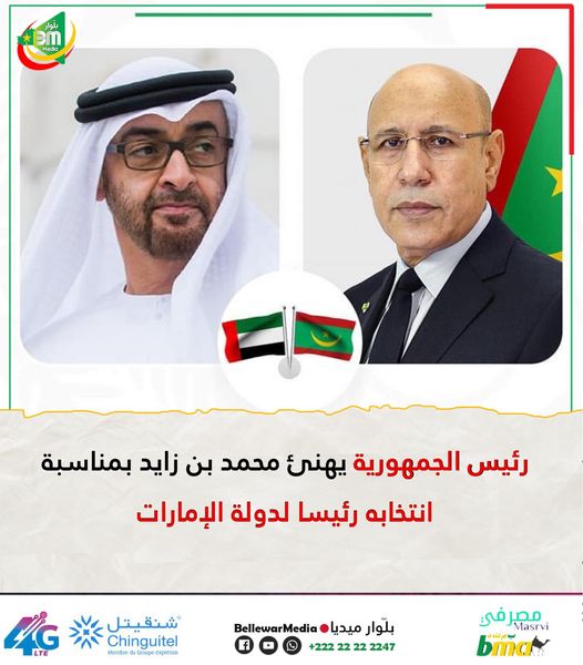هنأ رئيس الجمهورية ، محمدولدالشيخ الغزواني،صباح اليوم السبت ،الشيخ محمد بن زايد، بمناسبة انتخاب المجلس الأعلى للاتحاد له بالإجماع رئيسا لدولة الإمارات العربية المتحدة .