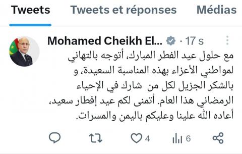 أعرب رئيس الجمهورية محمد ولد الشيخ الغزواني في تغريدة نشرها مساء الخميس، على “تويتر”، عن تهانيه لكافة الموريتانيين بمناسبة حلول عيد الفطر المبارك.