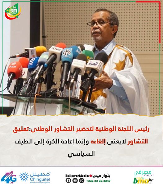 قال الوزير الأمين العام لرئاسة الجمهورية، يحيى ولد أحمد الوقف، رئيس اللجنة الوطنية لتحضير التشاور الوطنى، إن تعليق التشاور لايعنى إلغاءه وإنما إعادة الكرة إلى الطيف السياسي للإتفاق على مسار شامل يشمل جميع الأطراف بدون استثناء.