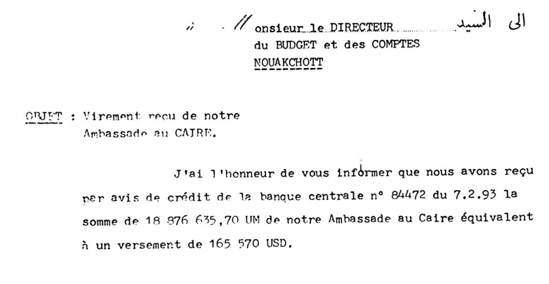 – باعت الدولة الموريتانية الفيلا المذكورة سنة 1992، ايام كنت أنا السفير المعتمد في القاهره، بمبلغ أربعة ملايين جنيه مصري (4,000,000.0) لشركة “المهندسون المصريون للاستثمارالعقاري العربي”، وذالك بموجب رسالة وزير المالية الموريتاني رقم 475بتاريخ 1992/09/12 والتي اعتمد فيها تقرير اللجنة المشتركة بين وزارة المالية و وزارة التجهيز عن المهمة التي كلفت بها في القاهرة والخاصة ببيع مكاتب السفارة وشراء مكاتب جديدة ومنزل لسكن السفير( انظر رسالة وزيرالمالية وتقرير اللجنة المرفقين)