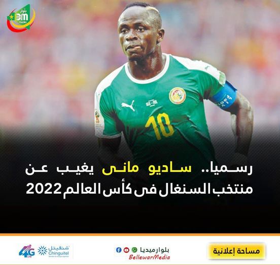 أعلن الاتحاد السنغالي لكرة القدم غياب نجم المنتخب ساديو ماني عن المشاركة في نهائيات كأس العالم قطر 2022، التي تنطلق الأحد المقبل، وذلك بسبب الإصابة.