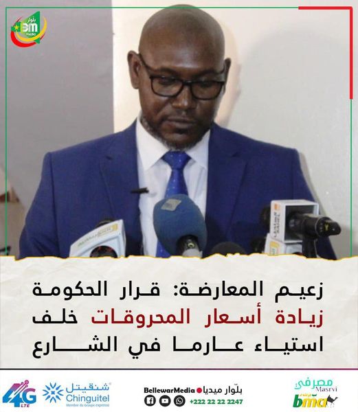 قال زعيم المعارضة إبراهيم ولد البكاي إن قرار الحكومة زيادة أسعار المحروقات خلف استياء عارما في الشارع خاصة لدى الطبقات الهشة، مؤكدا “تضامن المعارضة التام مع كل المتضررين من هذا القرار وتفهمها لامتعاضهم البالغ”.