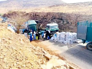 وشرع المواطنون في محاولات لتفريغ حمولة الشاحنة تمهيدا لفتح الطريق.