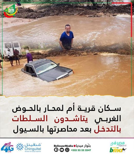 ناشد سكان قرية أم لمحار الوقعة في ولاية الحوض الغربى وتبعد 7 كيلومترات من افام لخذيرات، السلطات بالتدخل لمساعدة القرية المحاصرة بالأمطار والسيول.