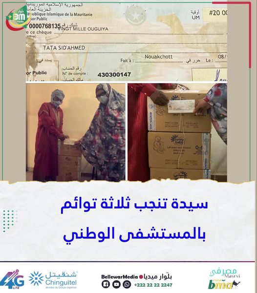 وصلت إلى قسم النساء والتوليد بالمستشفى الوطني 04/02/2022، سيدة قادمة من مقاطعة توجنين بالعاصمة نواكشوط، وهي تعاني من آلام المخاض وقد أجريت لها عملية قيصرية و أنجبت ثلاثة توائم: ولدين وبنت، ونظرا لظروف الأسرة المادية الصعبة فقد تكفلت إدارة مركز الاستطباب الوطني بكل مصاريف السيدة طيلة مقامها بالمستشفى، من تكاليف العملية وما ترتب عليها من دواء وغذاء، كما تكفلت بالأبناء الذين قضوا قرابة أربعة أيام في جناح خاص داخل قسم الأطفال، وبعد أن قرر الأطباء إمكانية مغادرتهم المستشفى منحتهم الإدارة هدية عبارة عن ثلاثة أكياس من حليب الأطفال (النوعية الممتازة) وشيك بمبلغ 200 ألف أوقية قديمة، وسلمت لهم ذلك رئيسة مصلحة الشؤون الاجتماعية، السيدة خديجة، وقد تسلم الهدية زوج السيدة الذي أكدت له رئيسة مصلحة الشؤون الاجتماعية على ضرورة العودة إليها في حال نفاد كمية الحليب لتزويده بكمية أخرى.