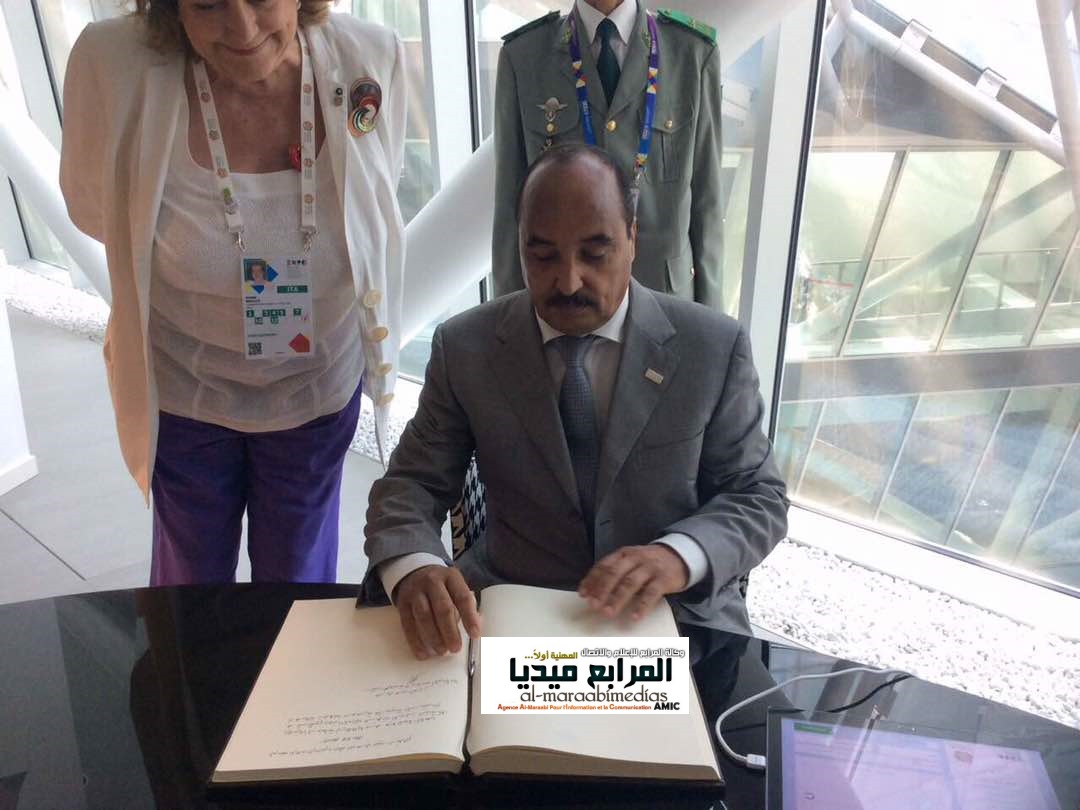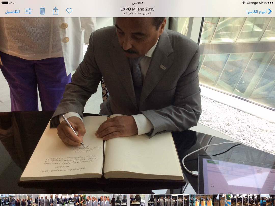 شاهد خط رئيس الجمهورية محمد ولد عبد العزيز – الصور نشرتها وكالة المرابع ميديا للإعلام والاتصال للرئيس و هو يدون في السجل الذهبي للمعرض الكوني الذي احتضنته ميلانو بايطاليا عام 2015 ….