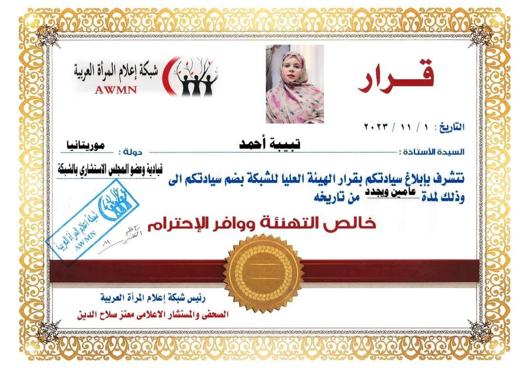 أعلنت شبكة إعلام المرأة العربية ضم الإعلامية الموريتانية الأستاذة تبيبة أحمد لتصبح قيادية وعضو المجلس الاستشاري بالشبكة.