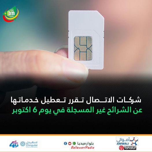أعلنت سلطة تنظيم الاتصالات في موريتانيا أن شركات الاتصالات قررت تعطيل خدماتها عن الشرائح غير المسجلة في يوم 6 اكتوبر.