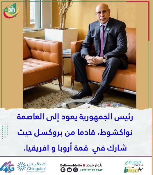 عاد رئيس الجمهورية، السيد محمد ولد الشيخ الغزواني، إلى العاصمة نواكشوط، قادما من العاصمة البلجيكية بروكسل حيث شارك في الدورة السادسة لقمة الاتحاد الأوروبي والاتحاد الإفريقي.