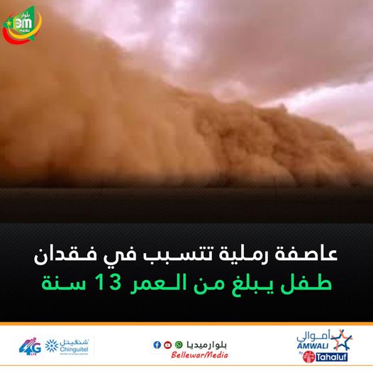 تسببت عاصفة رملية في فقدان طفل يبلغ من العمر 13 سنة، منذ يومين بمنطقة آوكار التابعة لمقاطعة تامشكط في ولاية الحوض الغربي .