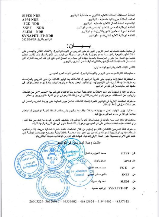 ــ دعوتنا الإدارة الجهوية بانواذيبو لاتخاذ إجراءات جدية اتجاه جريمة الاعتداء التي قام بها “المدنس” في حق الأستاذ، ونربأ بها عن الاصطفاف مع من ينتهج الضرب والتنكيل في حق الأستاذ وهو في ميدان الشرف التربوي يؤدي عمله.