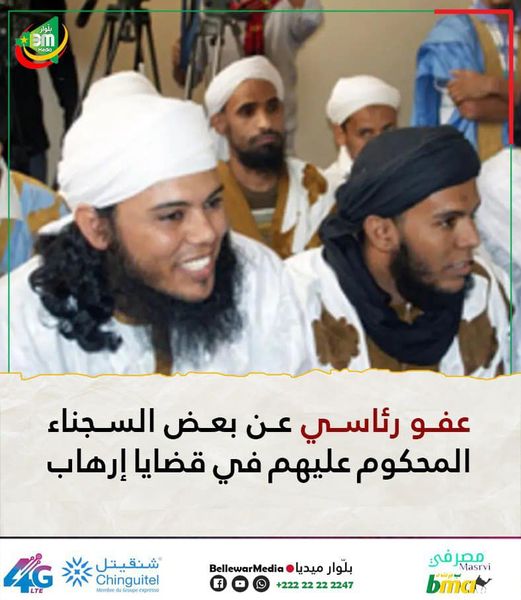 أصدر رئيس الجمهورية محمد ولد الشيخ الغزواني مرسوما بالعفو عن بعض السجناء المحكوم عليهم في قضايا إرهاب، وقد استفاد من هذا العفو ثمانية سجناء أعلنوا “توبتهم ومراجعتهم لأفكارهم وتخليهم عن تبني أفكار التطرف والعنف وتم التوثق من ذلك عن طريق لجنة من كبار العلماء”.