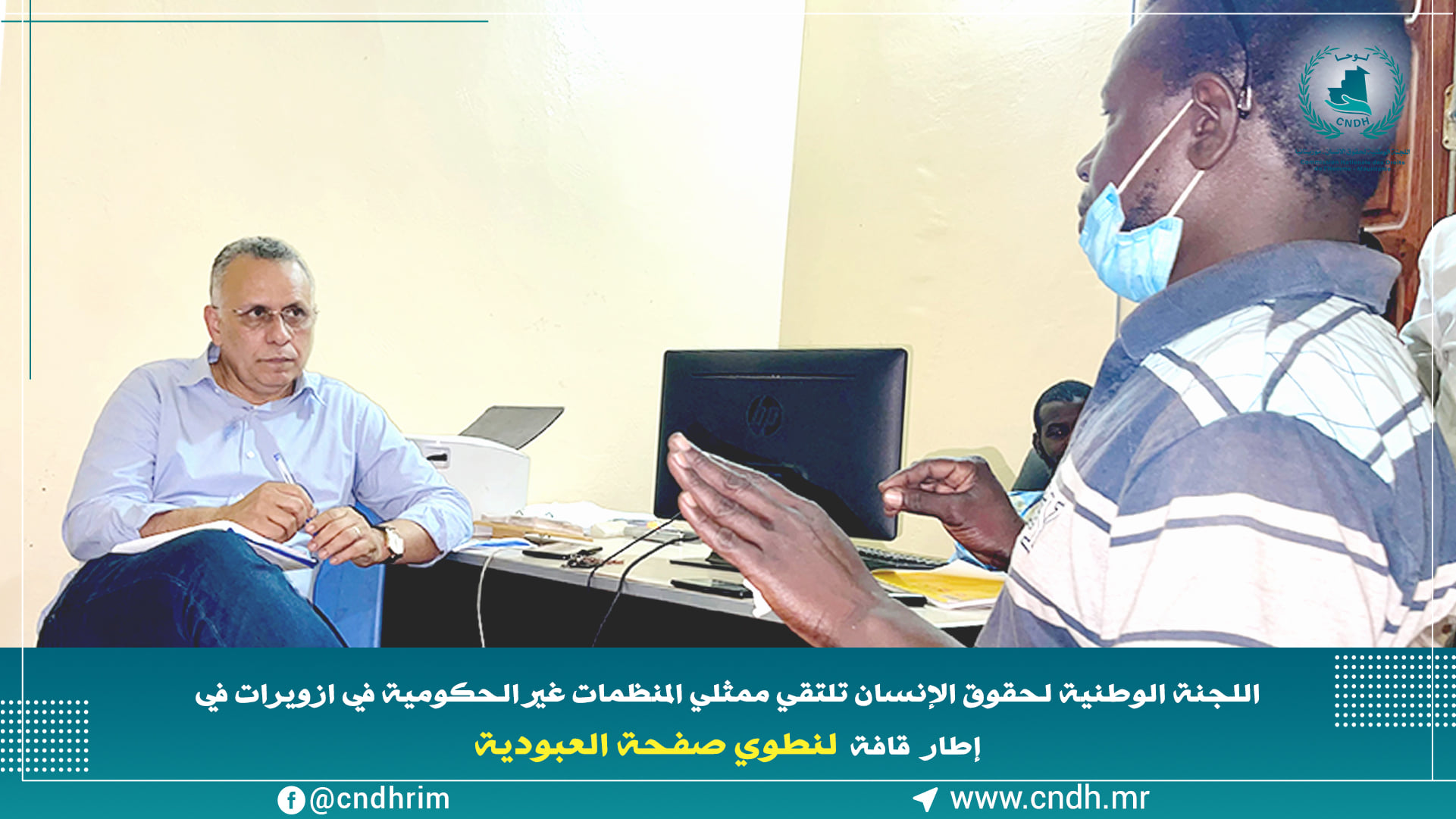 عقدت قافلة الحقوق التي أطلقتها اللجنة الوطنية لحقوق الإنسان في الولايات الشمالية، عدة لقاءات في مدينة ازويرات شملت السلطات الإدارية والأمنية، والمجلس الجهوي، إضافة إلى متقاعدي الشركة الوطنية للصناعة والمناجم (اسنيم)، ونقابات عمال الشركة، ومنظمتي مشعل الحرية، ونجدة العبيد.