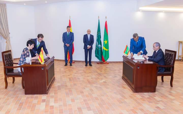 أشرف رئيس الجمهورية رئيس الاتحاد الافريقي، السيد محمد ولد الشيخ الغزواني، عصر اليوم الثلاثاء بالقصر الرئاسي في نواكشوط، رفقة رئيس الحكومة الإسبانية السيد بيدرو سانشيز، على توقيع مذكرة تفاهم، تتعلق بالهجرة الدائرية، و إعلان نوايا مشترك حول مكافحة الجريمة المنظمة.