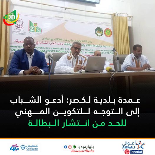 مشيرا إلى أن “تكوين الشباب ودمجه في الحياة النشطة يدخل في إطار برنامج فخامة رئيس الجمهورية السيد محمد ولد الشيخ الغزواني الذي يولي أهمية كبيرة للشباب.” على حد قوله.وأضاف العمدة في كلمة له اليوم الأحد ضمن منتديات نواكشوط للثقافة و الشباب والرياضة على مستوى بلدية الكصر، “أن هذه المنتديات تسعى لتسهيل كافة الصعاب أمام الشباب للمساهمة في تحقيق بناء الوطن.”